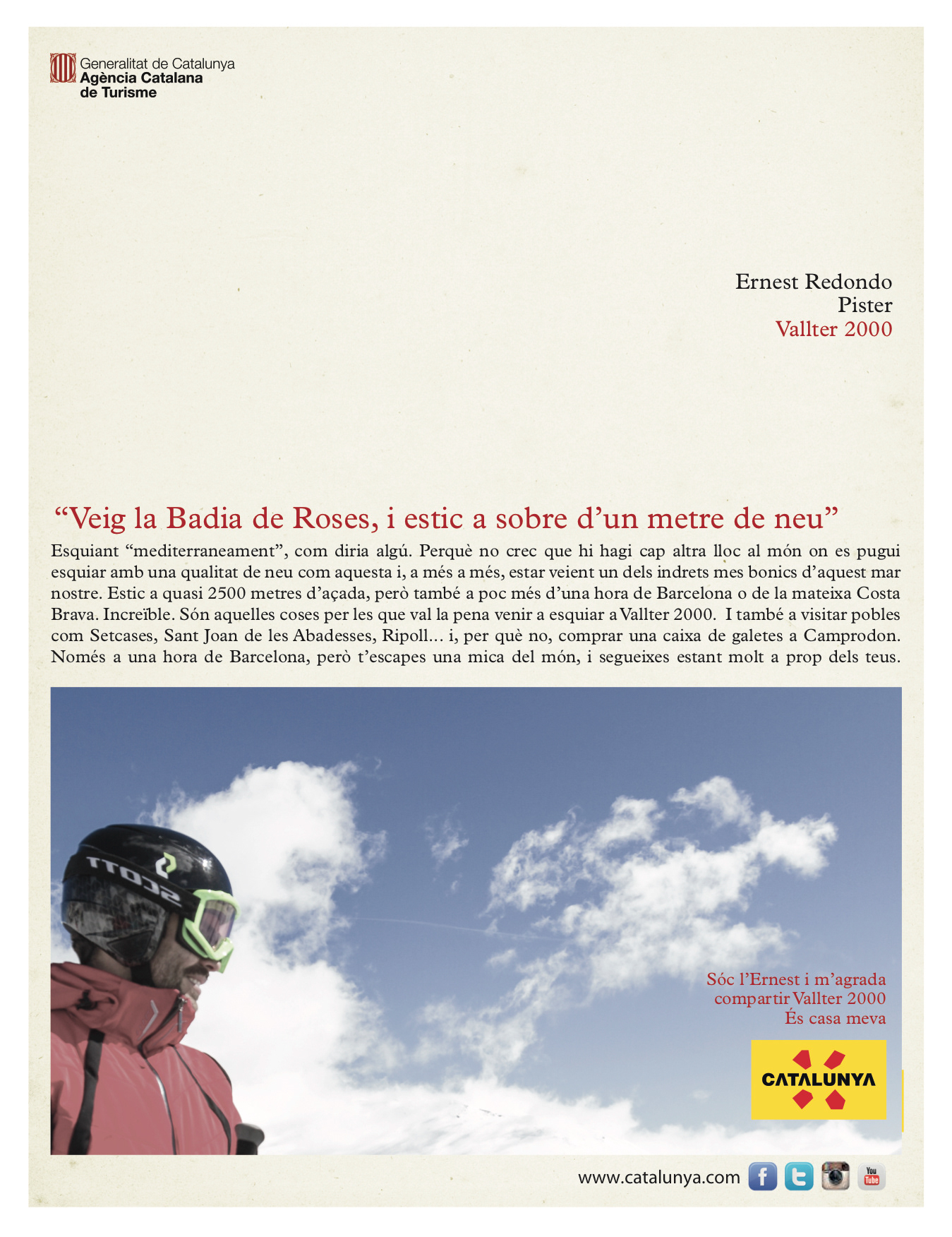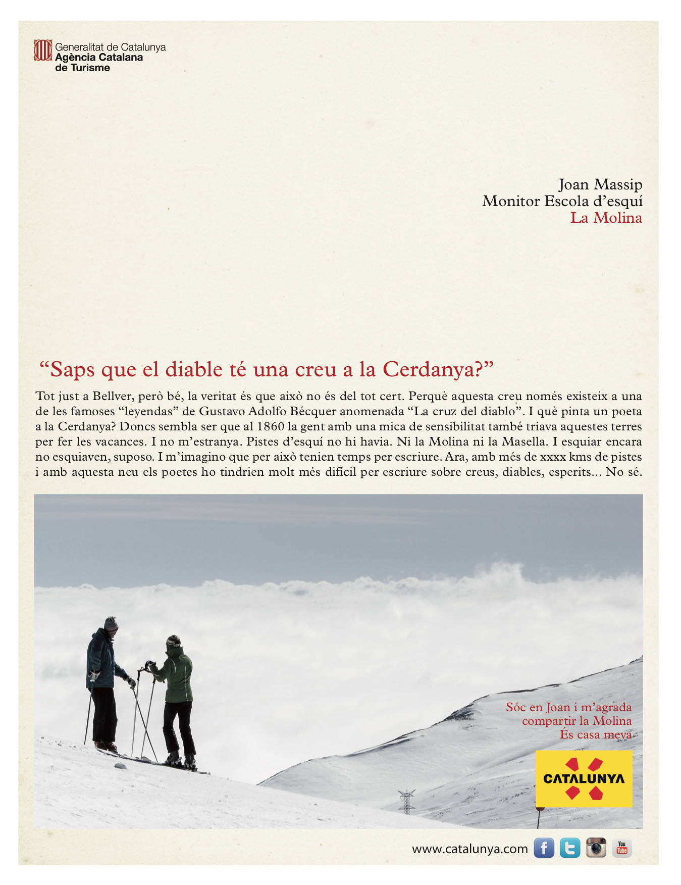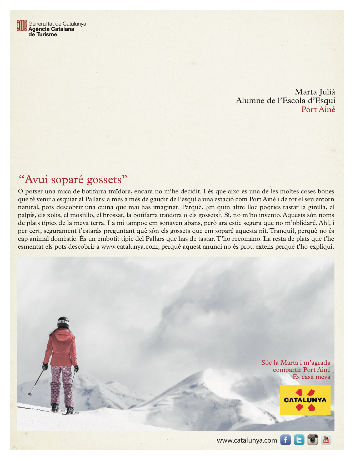 Campaña gráfica en medios convencionales para la difusión del concepto "Catalunya és casa teva" de l'Agència Catalana de Turisme, dirigido al turismo interno (doméstico) durante la temporada invernal.